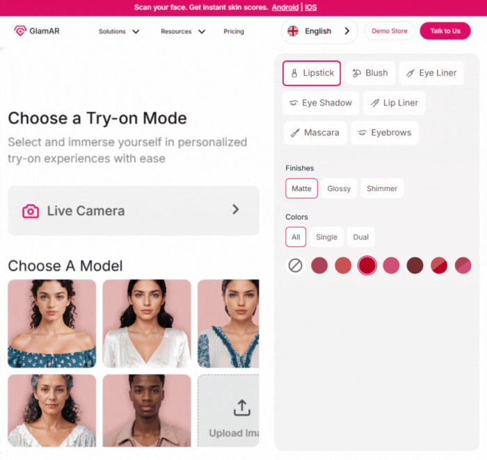 Your customers can virtually try on the make-up kits in real time. They can make use of the live camera feed or upload a photo to get makeup digitally placed in real time. The application is very realistic and can be done across multiple categories like lipstick, blush, mascara, and more, with different finishes like matte, shimmer, etc