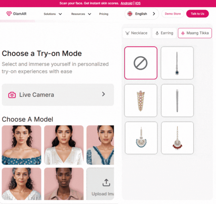 With GlamAR, you can create different models that can represent your different maang tikka designs available. All of these can be displayed in your virtual showroom. Through this, customers can alternate between the designs and pick their preferred choice before leaving the page. In essence, there can be a variety of choices that display your designs, from which users can pick without unnecessary stress.